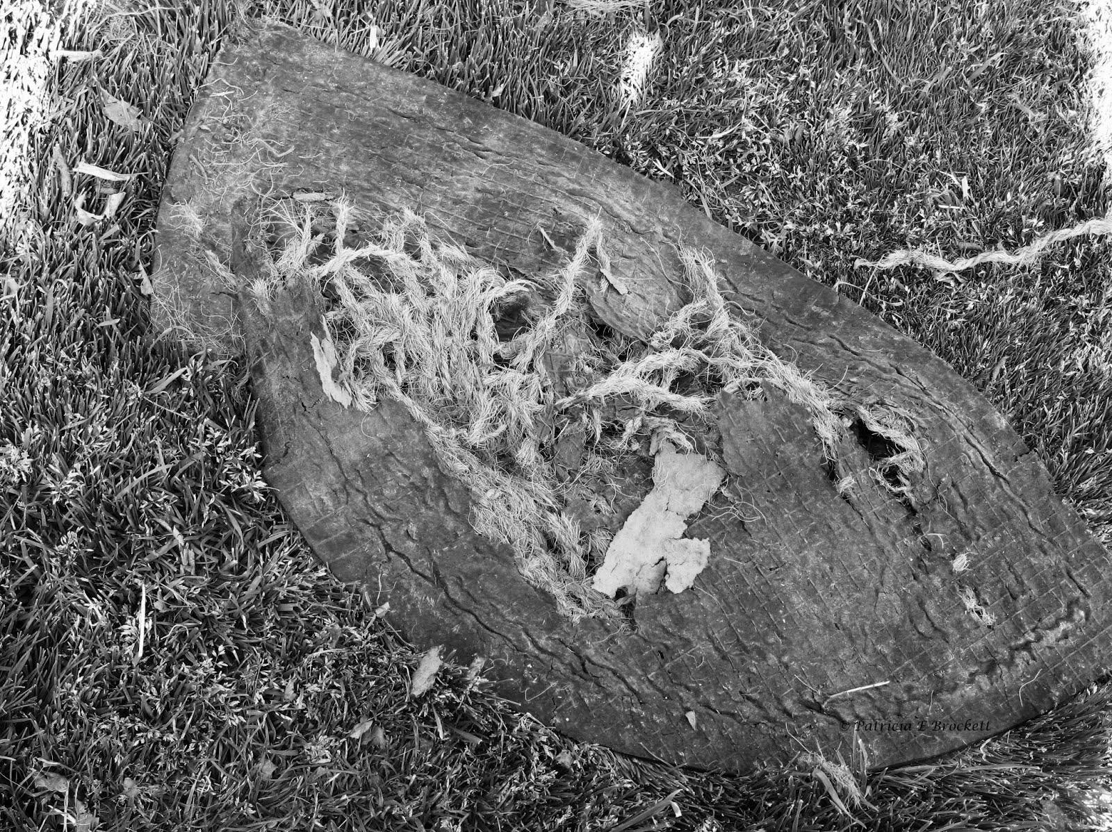 Sign indicating ownership. Father Bernard Hubbard, a Jesuit explorer, used this boat in the first half of the 1900's. He became known as the "glacier priest."