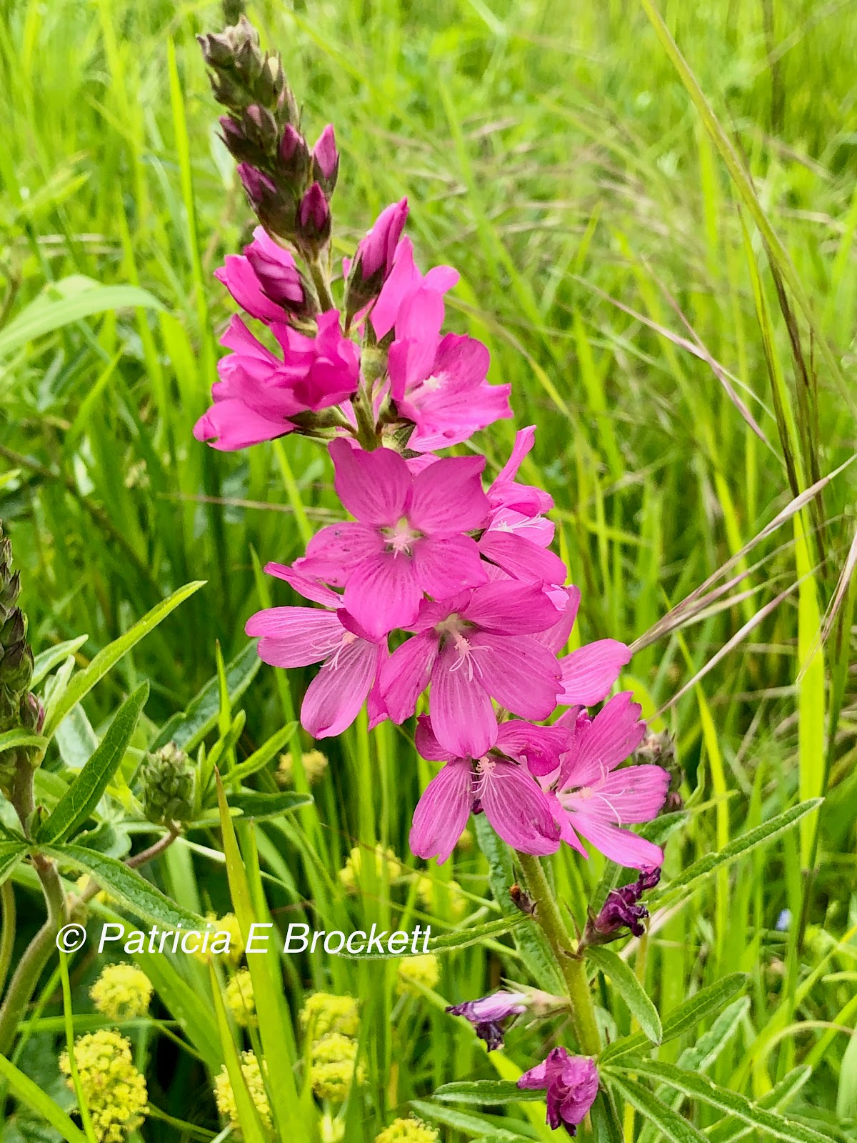 | A rosy checkermallow plant in bloom with a yellow barestem biscuit root peeking out below among the blades of grass |
