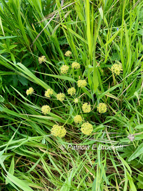 | Yellow barestem biscuit root plant in bloom. The blossom arrangements remind me of bursts of yellow firecrackers exploding. |